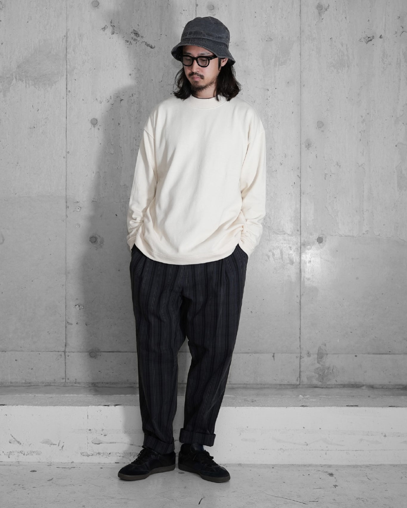 -大きめに取った身幅と長めの着丈、袖丈によりオーバーサイズのシルエットであるものの、肩の位置は極端に落としておらず、また袖口にリブを採用することで、ルーズな溜まり感がありながら、だらしなくなりすぎないように計算